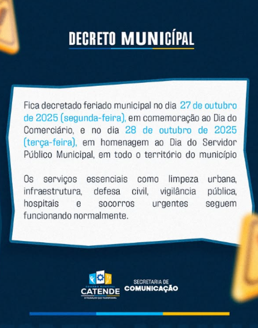 Feriado MunicipalFoi decretado feriado nos dias 27 e 28 de outubro.✅ Segunda-feira — Dia do Comerciário✅ Terça-feira — Dia do...